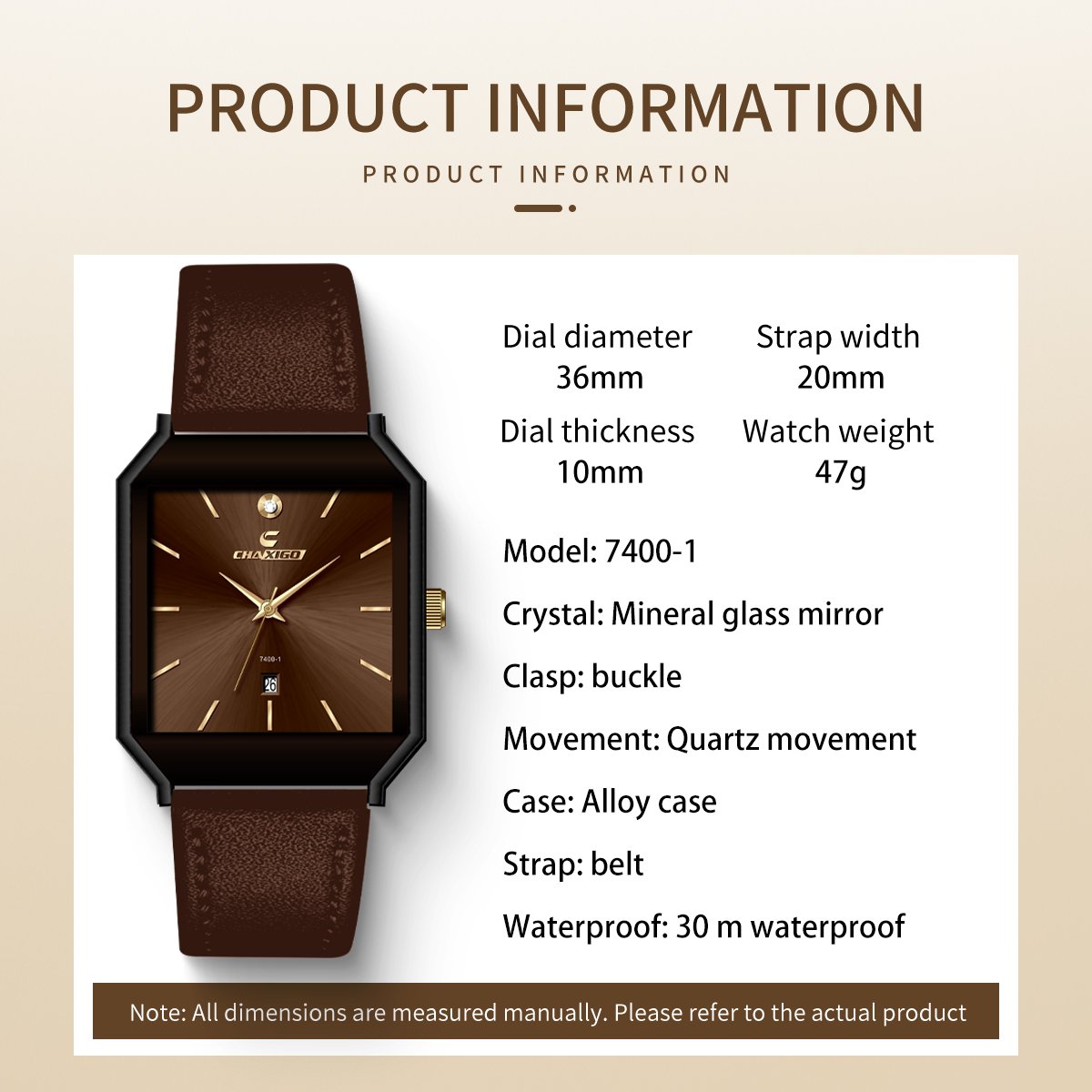 Equipped with a quartz movement, mineral glass mirror (scratch-resistant), alloy case (rigid/stylish with metallic texture), leather strap (exquisite touch), and a needle buckle, it also offers 30m life waterproofing (handles splashes, rain, and cold showers).