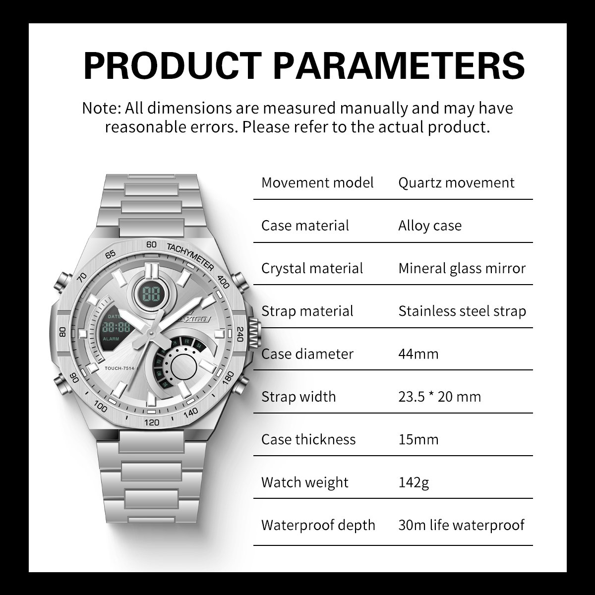 It features practical functions: clear/easy-to-read scales/hands (for seizing business opportunities), a mineral glass mirror (high-definition, scratch-resistant to show taste), a stainless steel strap (forged from fine steel, corrosion/wear-resistant), luminous pointers (clear time-reading in darkness), and 30m life waterproofing (suitable for daily water scenarios).