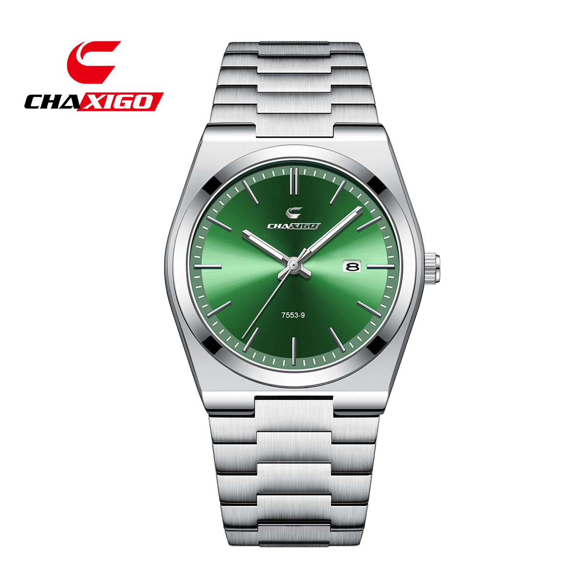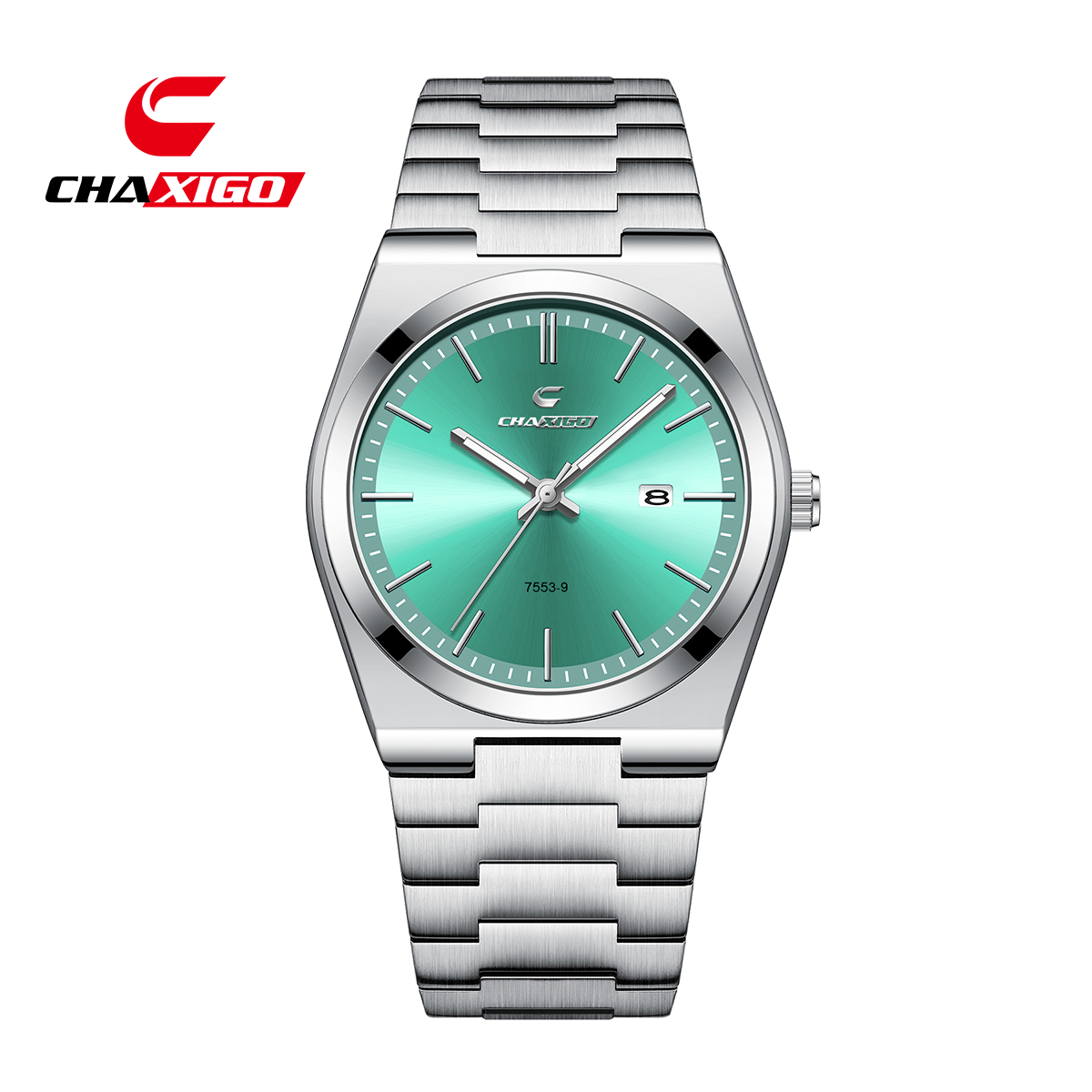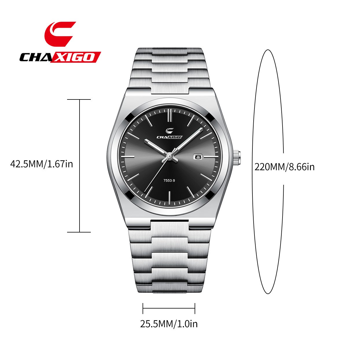 This CHAXIGO watch (model DYN-7476-2) features a mineral glass mirror, stainless steel strap, and quartz movement.