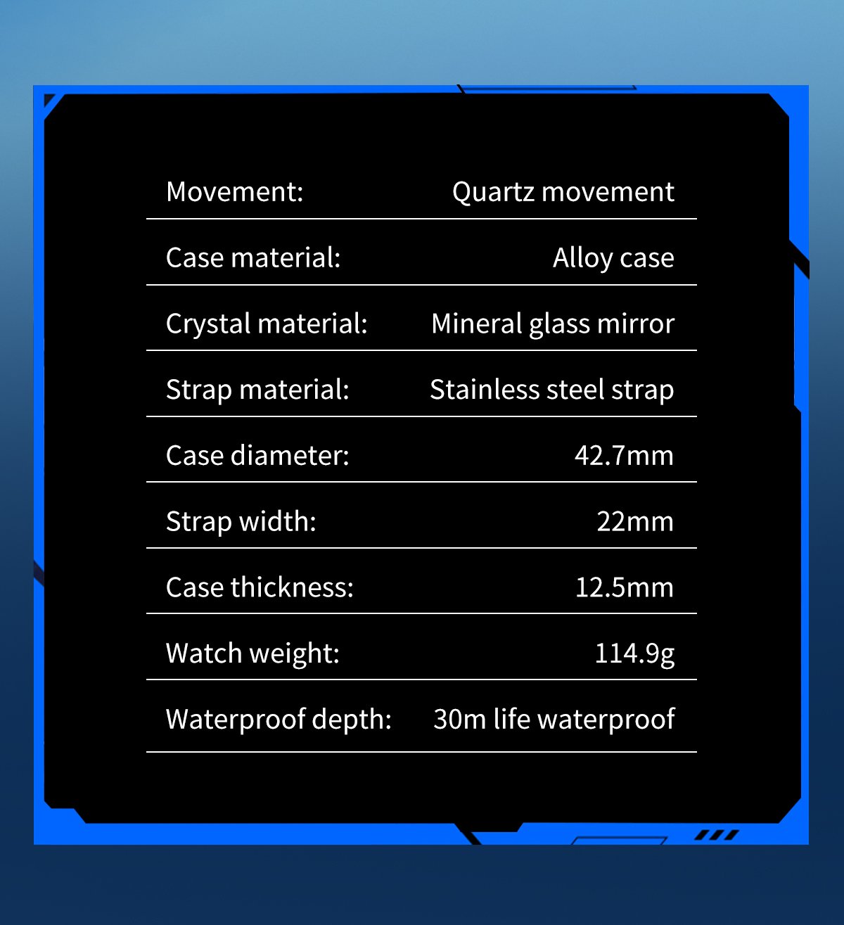 It has practical functions like luminous pointers (clear time reading in darkness), 30m life waterproof (suitable for daily use), and mineral glass mirrors (wear-resistant and scratch-resistant for protection). Equipped with a quartz movement, alloy case, and stainless steel strap, its parameters fit daily wearing.