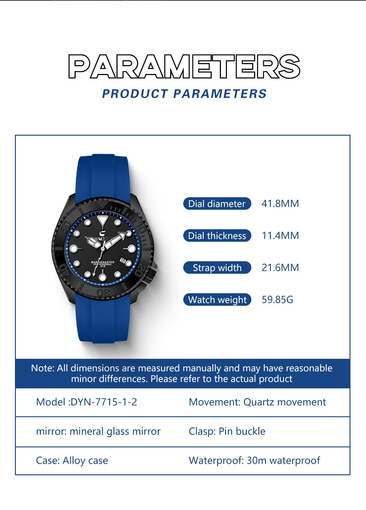 This new-style men’s watch features a fashionable design. It comes with a mineral glass mirror for elegance and high-end texture, a quartz movement, an alloy case, and a breathable silicone strap.
