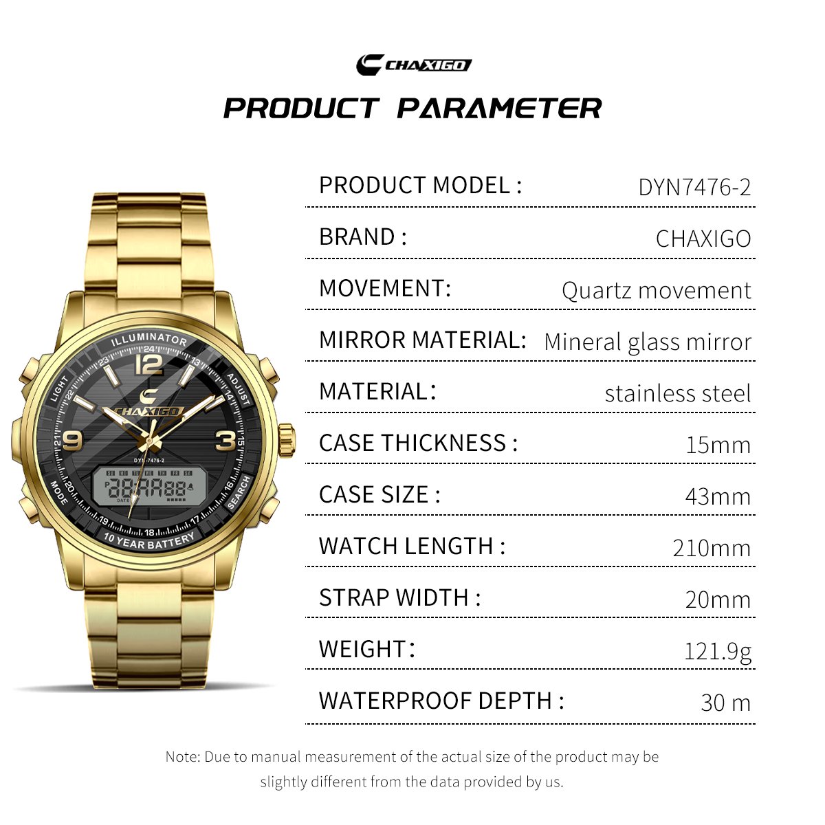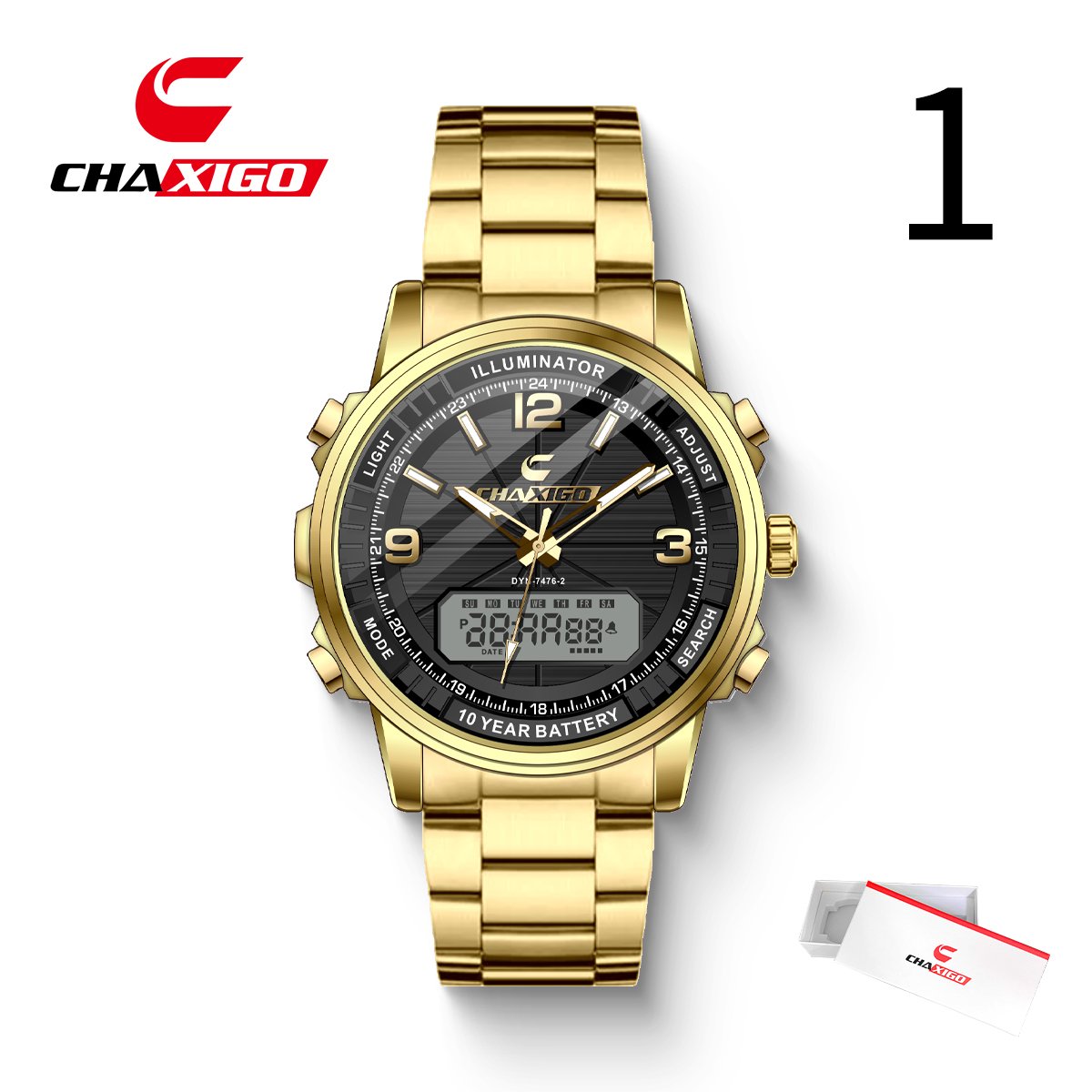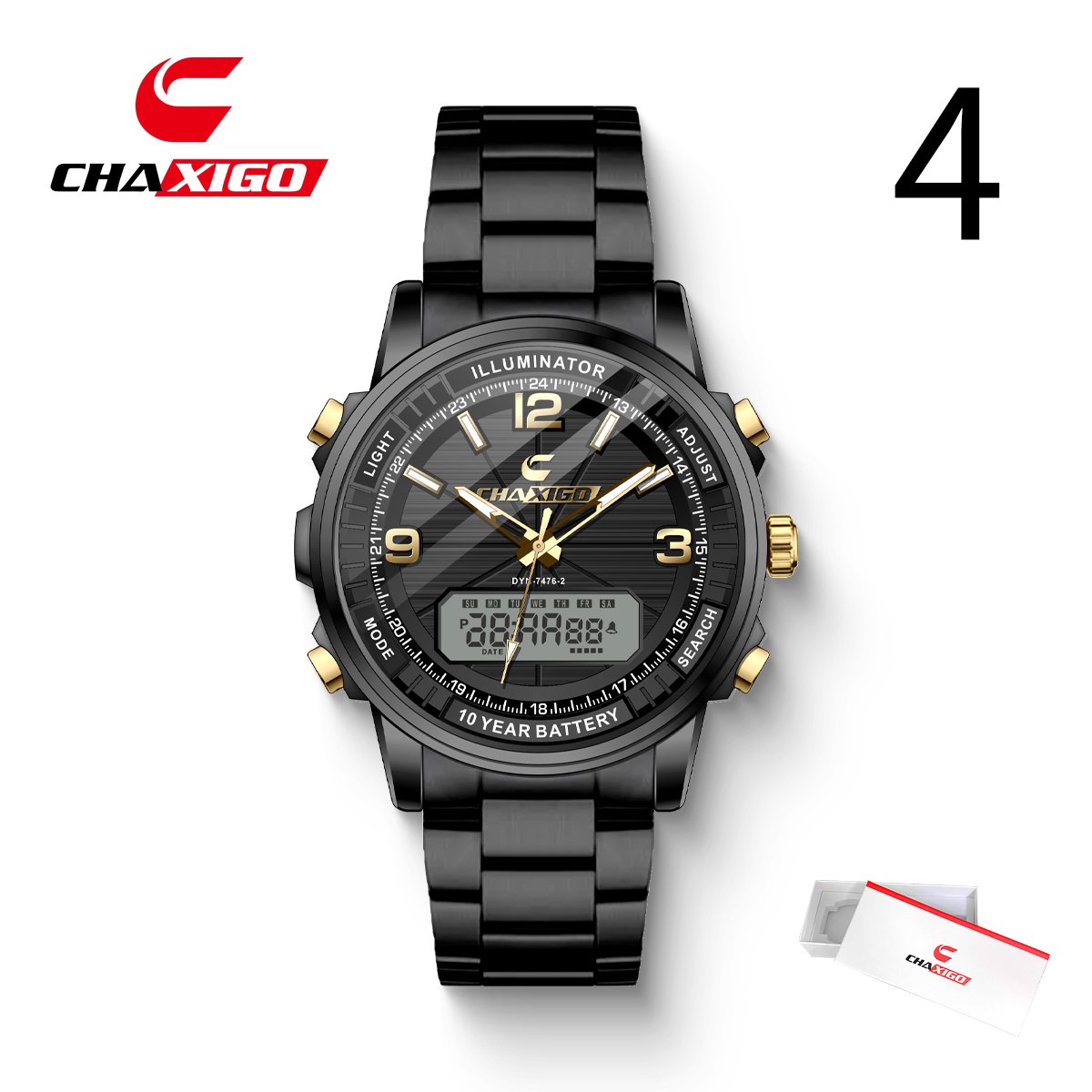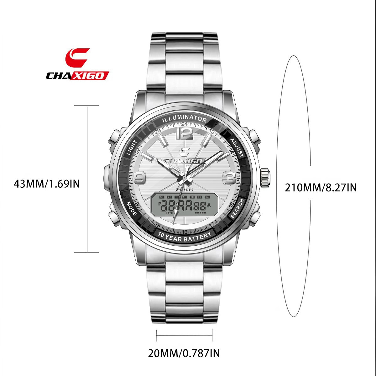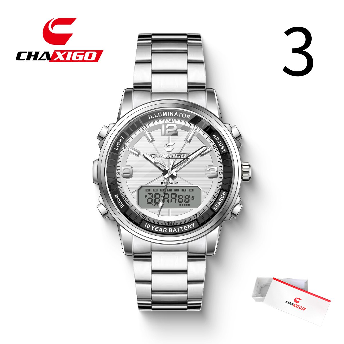 This CHAXIGO watch (model DYN-7476-2) features a mineral glass mirror, stainless steel strap, and quartz movement.
